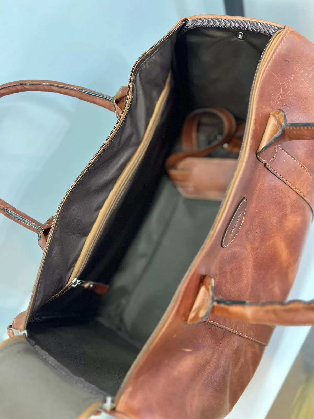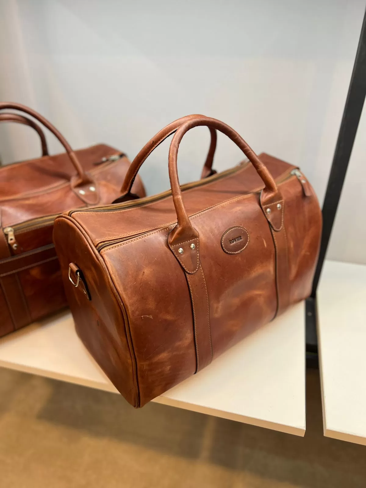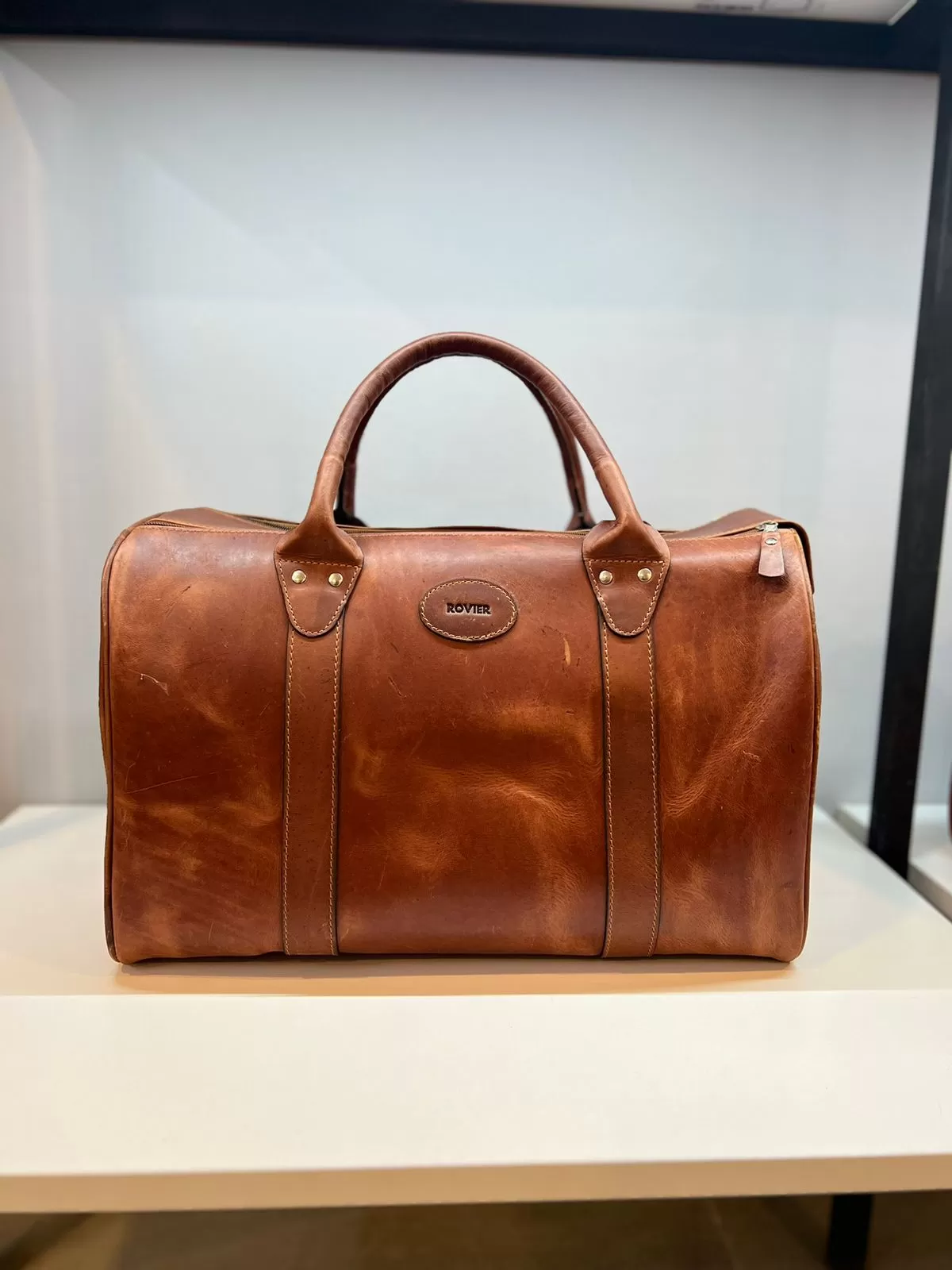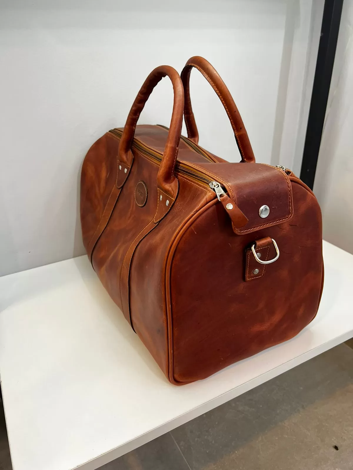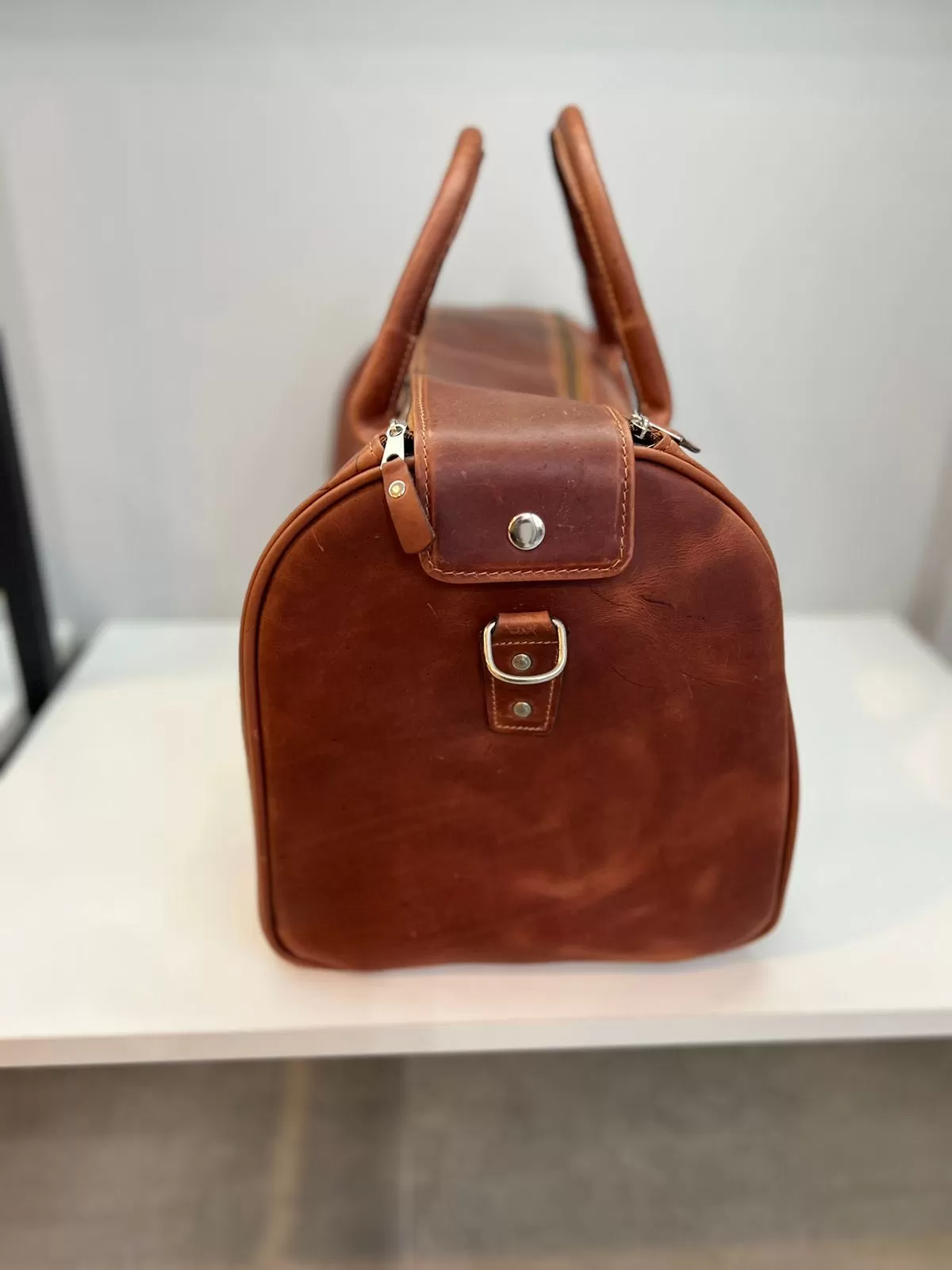 Nuestro bolso de viaje Filadelfia, fabricado en cuero genuino y con medidas de 40 x 27 cm, es ideal para escapadas cortas, viajes de negocios o como bolso de mano. Cuenta con asas de cuero, correa larga desmontable con hombrera acolchada, bolsillo trasero con cierre y pasador posterior para sujetarlo cómodamente a una maleta tipo carry-on. El interior está completamente forrado y equipado con un bolsillo con cierre para mantener tus objetos seguros y organizados.