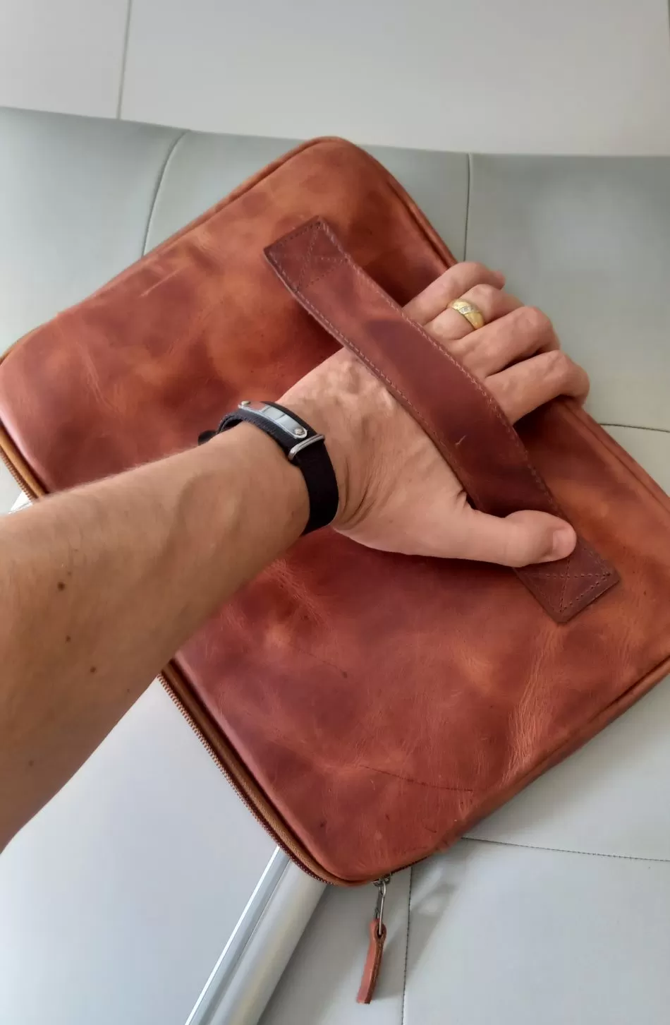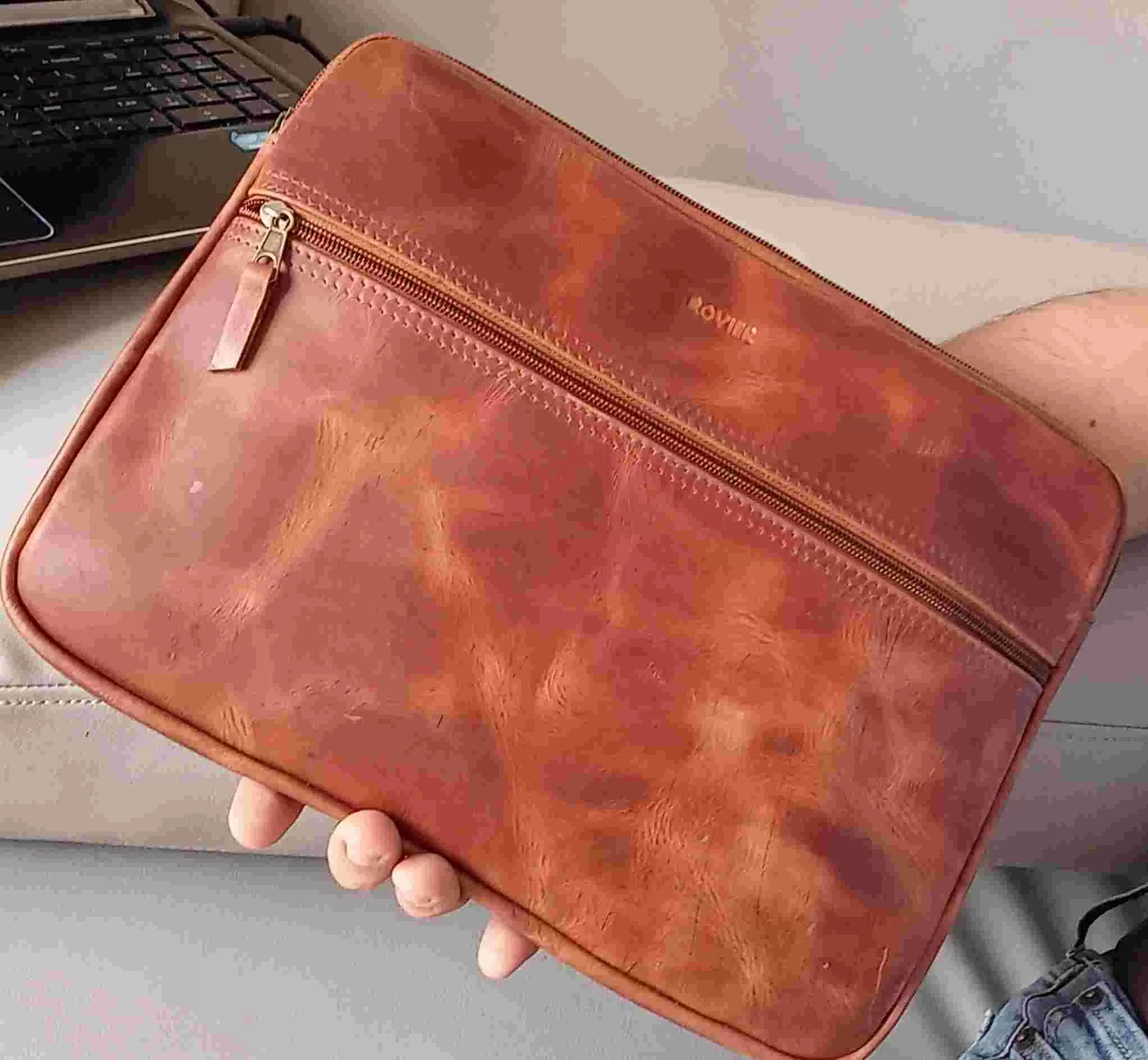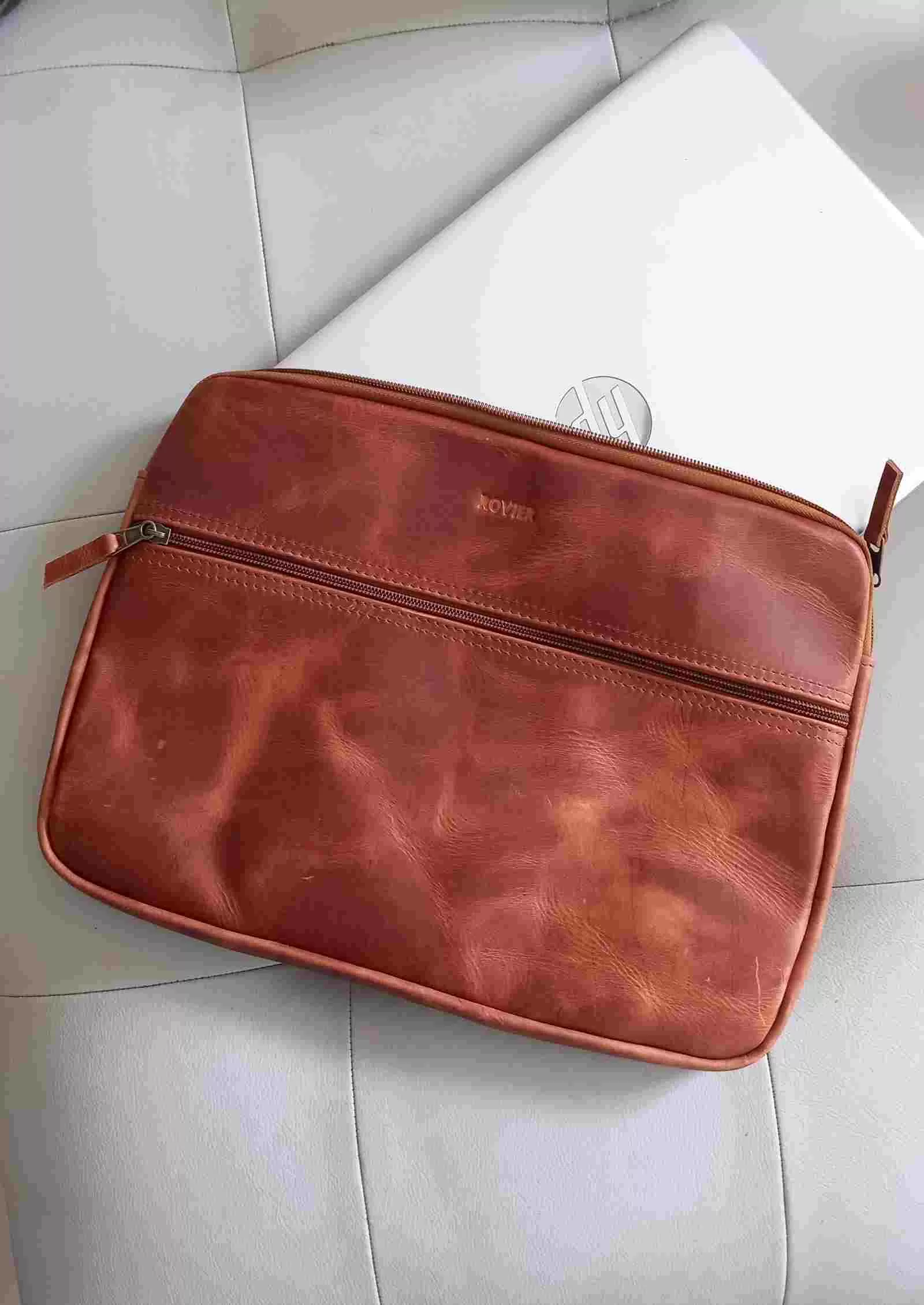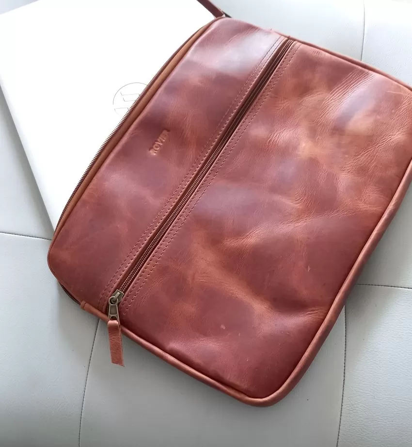 Funda de cuero suave para laptop, hecha a medida. Con bolsillo externo con cierre, pasador de mano, interior forrado y personalización con grabado láser. Tiempo de entrega: 7 días.