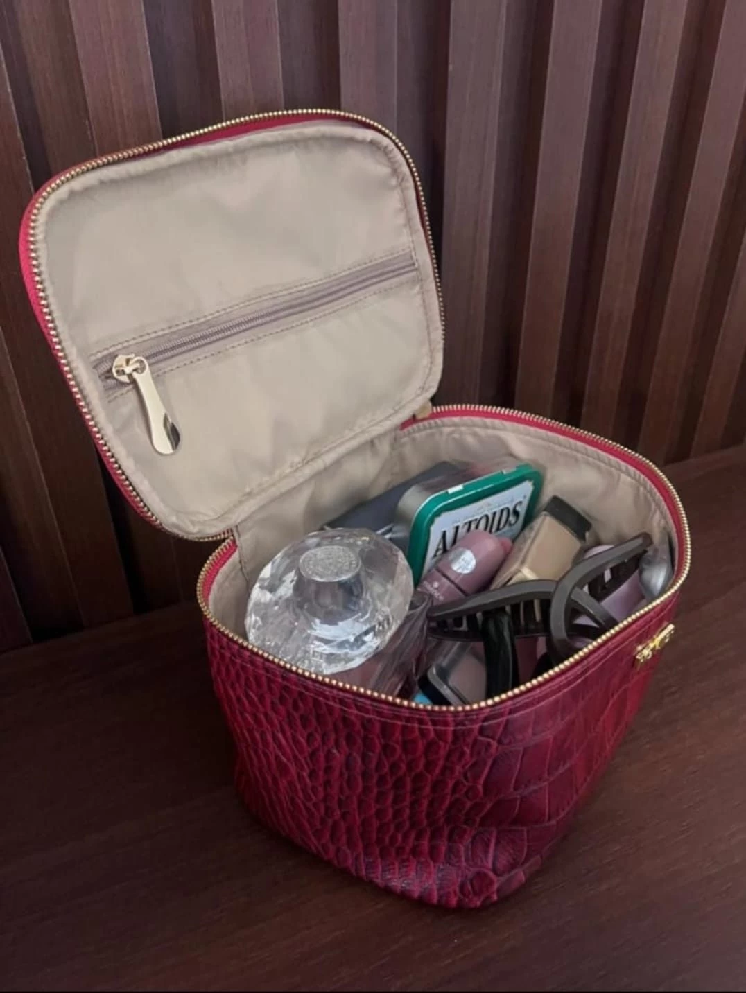 El Neceser Baúl para dama de Rovier es el accesorio perfecto para organizar tus esenciales con estilo. Confeccionado en cuero vacuno de primera calidad, cuenta con interior forrado, amplio espacio y diseño estructurado tipo baúl. Ideal para guardar maquillaje, cosméticos y artículos personales, su formato compacto de 21 cm de ancho × 15 cm de profundidad lo hace práctico para viajes o uso diario. Elegancia, funcionalidad y artesanía boliviana en cada detalle.